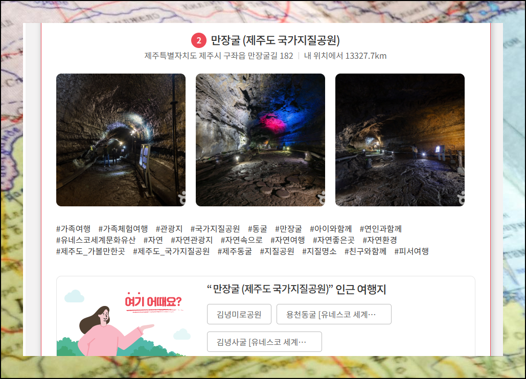 상세 소개와 다양한 이미지로 장소를 깊이 있게 살펴보세요. 인기 명소뿐 아니라 감녕사굴이나 미로공원 같은 숨은 보석도 발견해보세요. 생각보다 국내에 우리가 알지 못하고 있는 좋은 곳이 많이 있습니다.