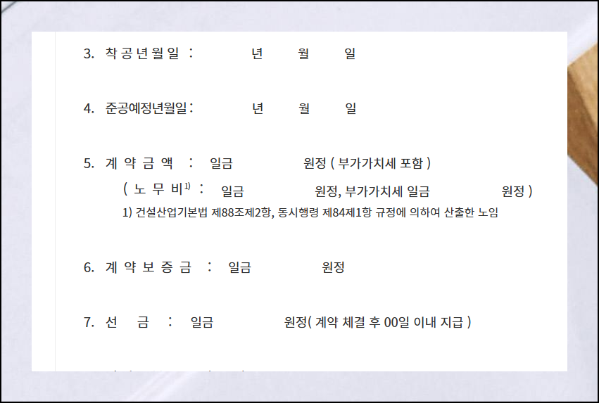 해당 양식을 이용하면 문제가 될 만한 것들을 사전에 예방하는 데에 큰 도움이 됩니다. 여기에는 공사명, 위치, 착공일, 준공예정일부터 세부 계약조건까지 모든 필수 항목이 체계적으로 정리되어 있어요.