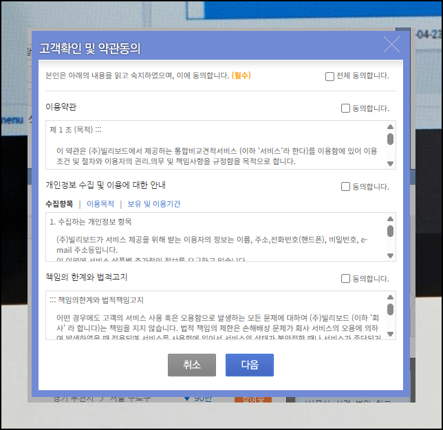 의뢰목적과 고객성향, 원하는 이전 옵션을 모두 표시한 후 [신청] 버튼을 클릭하세요. 연락받을 정보를 기입하고 [다음]을 누르면 여러 업체의 사무실 이사 견적비교가 한눈에 가능해요. 모든 단계를 마치지 않더라도 초기 화면의 가격표로 대략적인 시세 파악이 가능합니다.