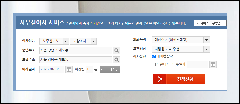 필요한 기본 데이터만 입력하면 여러 업체의 이사 견적을 한꺼번에 받아볼 수 있어 편리합니다. 이전 날짜가 확정되어 있다면 더욱 정확한 비용 산출이 가능하니 가능한 빨리 일정을 결정하는 것이 좋아요.