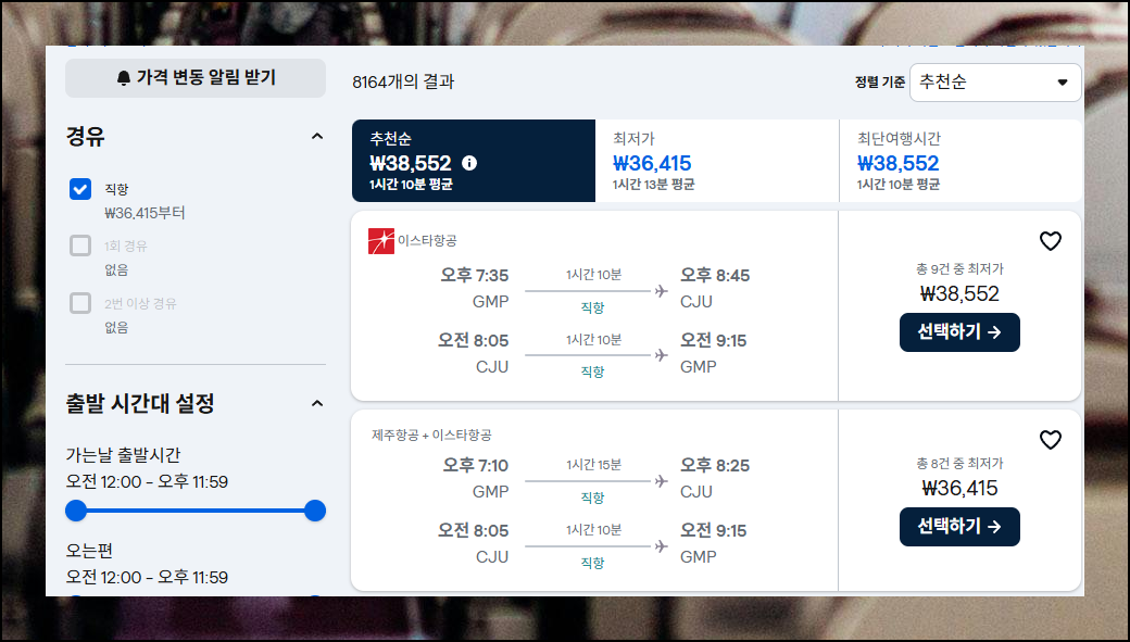 찾은 제주 왕복 저가항공권의 가격은 37,834원입니다. 자신이 찾은 티켓의 가격이 마음에 든다면 '선택하기' 버튼을 눌러 예매를 진행하면 되는데요. 여기서 좀 더 저렴한 금액을 원한다면 '가격 변동 알림 받기' 기능을 사용해보세요.