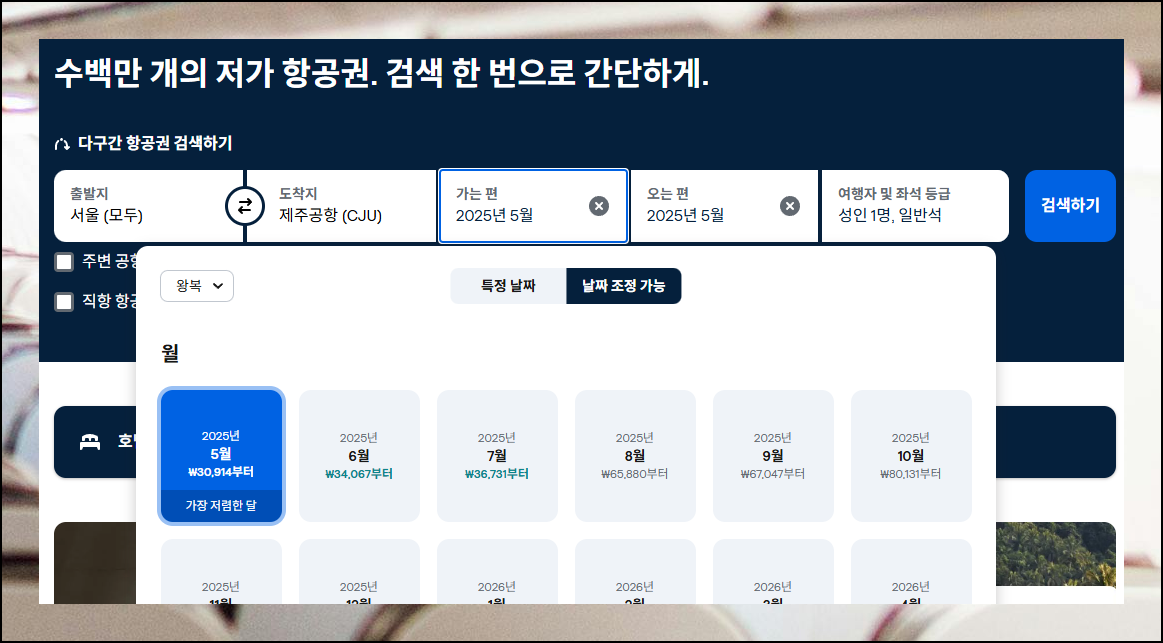 제주도를 도착지로 선택한 후, '날짜 조정 가능' 옵션으로 가는 날과 오는 날을 설정하세요. 이렇게 하면 날짜별 예매 요금에 대한 차이를 한눈에 살펴볼 수 있어요. 비행기표는 날짜에 따라 금액이 크게 달라지므로 이 과정이 매우 중요합니다.