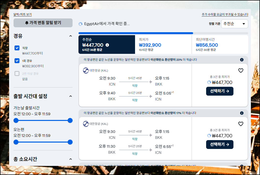 현재 국내에서 태국으로 직항으로 갈 수 있는 도시는 방콕이 유일합니다. 이제 실제 비행시간을 확인하면서 저렴한 티켓을 찾는 방법을 알아볼게요.