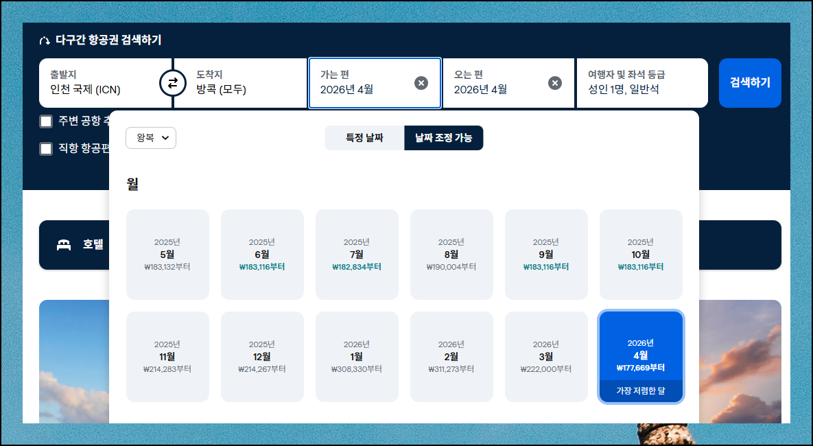 항공편 웹사이트에서 출발일과 귀국일을 한 달 단위로 선택합니다. "날짜 조정 가능" 탭을 누르면 한 달 단위로 날짜 지정이 가능해요.