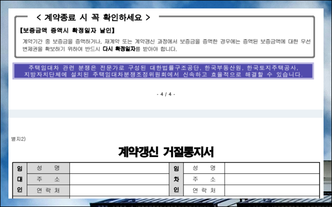표준 임대차계약서 뒷면에는 법적 보호를 받기 위한 주요 정보가 담겨있습니다. 약정 체결 전 반드시 읽어보시고, 필요할 경우 별지2의 계약갱신 거절통지서 양식도 활용하세요.