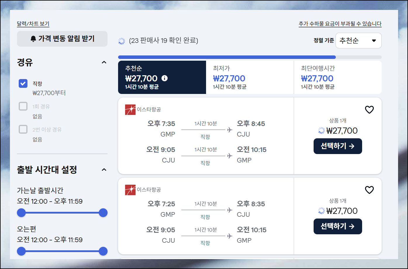 그 결과 왕복으로 27,979원이면 제주도를 다녀올 수 있었습니다. 이런 식으로 날짜 조정이 가능하면 꽤 저렴한 가격으로 항공권 예약 진행이 가능해요.