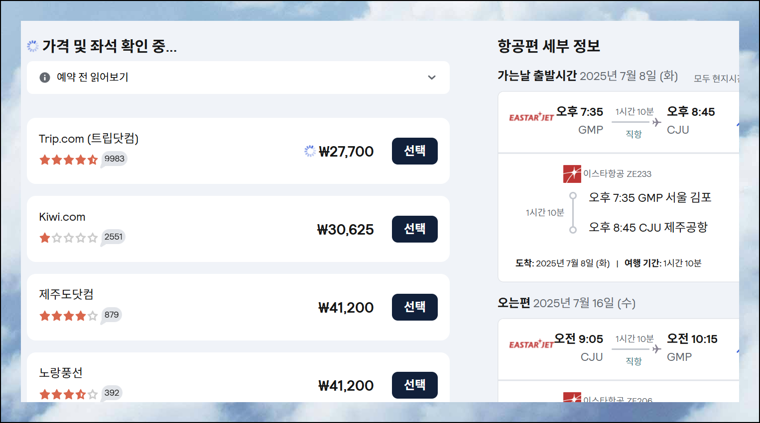 마음에 드는 항공편을 찾았으면 항공편 리스트에서 "선택" 버튼을 눌러보세요. 여러 예약 업체 목록이 나타날 거예요. 가격뿐만 아니라 업체 평점도 꼼꼼히 확인하세요. 신뢰할 수 있는 사이트를 고르는 것이 중요합니다.