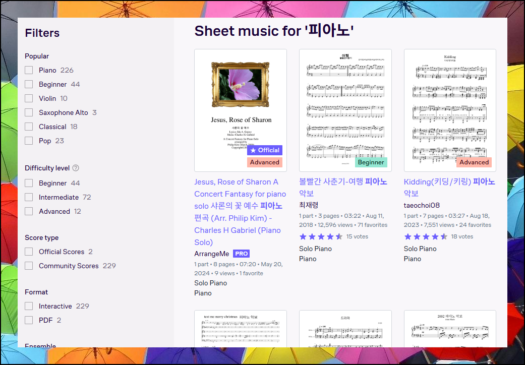 이 기능을 사용하면 수많은 무료 자료 중에서 원하는 조건에 맞는 것만 골라 볼 수 있어요. 자신의 실력이나 취향에 맞는 곡을 빠르게 찾을 때 정말 유용한 도구입니다.