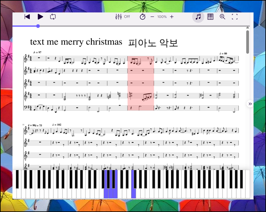방금 제가 찾아본 피아노 악보입니다. 여기서 보면 연주를 들을 수 있는 재생 버튼이 있는데요. 해당 버튼을 누르면 악보에 빨간색 표시가 나타나면서 해당 부분의 연주가 진행됩니다. 마치 선생님이 옆에서 직접 연주해주는 것처럼 들을 수 있어요.