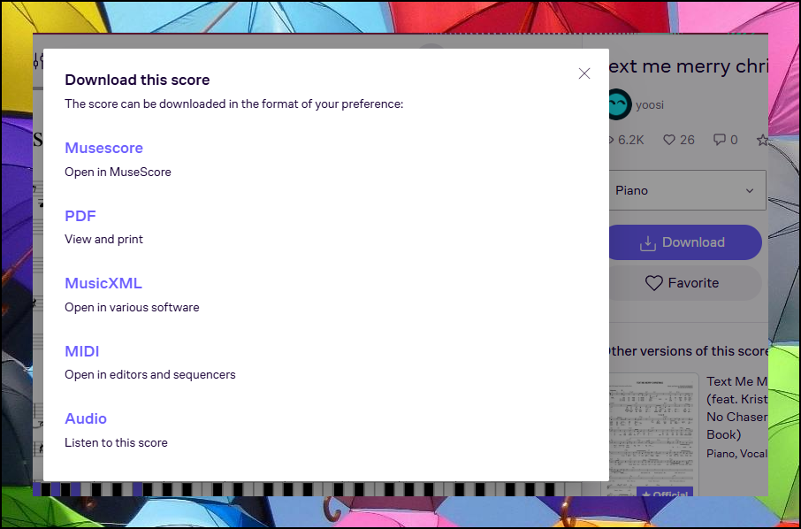 마지막 단계로 오른쪽의 다운로드 버튼을 클릭해보세요. PDF 형태나 전용 파일로 자료를 저장할 수 있어요. 사이트에서 재생해준 연주 음악도 음원 파일로 다운로드 가능합니다. 이렇게 다양한 형태로 받을 수 있으니 자신의 필요에 맞게 선택해보세요.