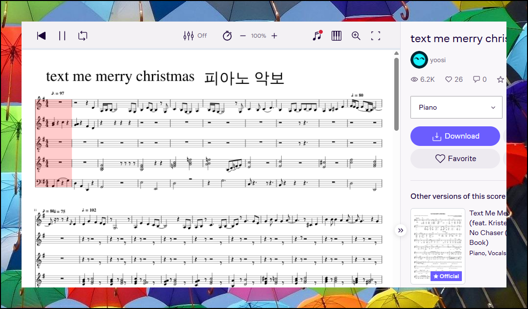 선택한 악보가 화면에 바로 표시됩니다. 재생 버튼을 클릭하면 실제 연주 음악을 들을 수 있습니다. 악보를 보면서 동시에 연주를 들어보면 음표들이 어떤 소리를 내는지 자연스럽게 이해하게 됩니다.
