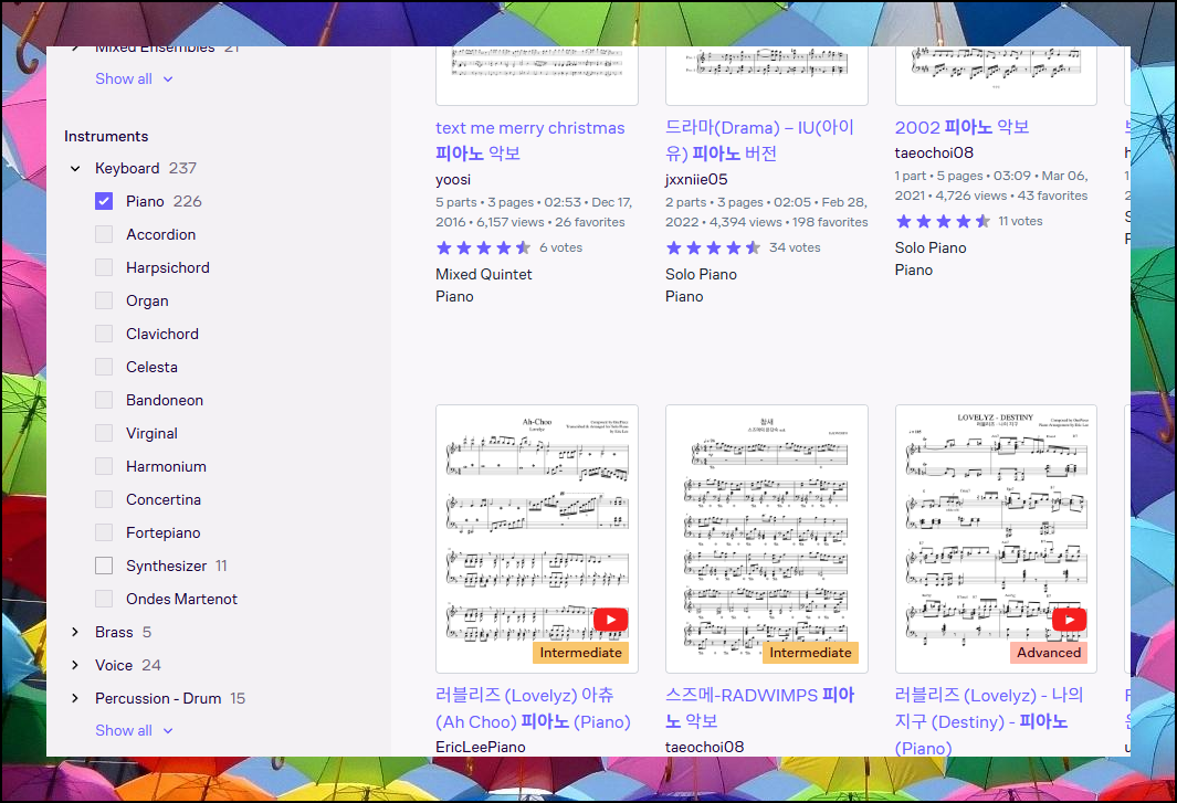 왼쪽 필터 메뉴에서 인스트루먼트 항목을 확인해보세요. 여러 악기 중에서 키보드 섹션의 'piano'를 선택하면 피아노 연주가 가능한 곡들만 골라서 볼 수 있습니다. 다른 악기용 악보들은 자동으로 제외되니까 자료를 찾는 시간이 단축돼요.