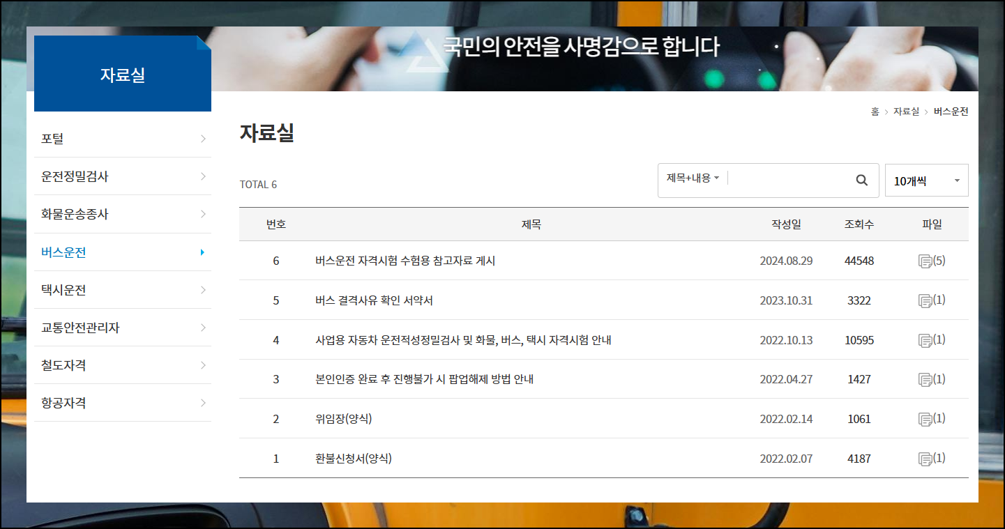 사이트 내 자료실에는 운전 관련 다양한 카테고리가 준비되어 있어요. 버스운전 관련 섹션을 클릭하면 "자격시험 수험용 참고자료"를 손쉽게 다운로드할 수 있습니다.