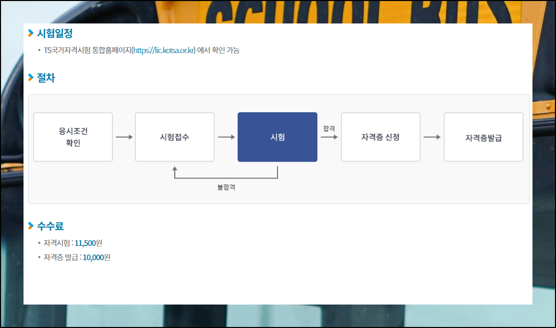 웹사이트에 접속하면 버스운전 자격시험에 대한 상세한 가이드를 볼 수 있어요. 접수부터 합격 조건까지 모든 내용이 정리되어 있습니다. 상단의 '바로가기' 메뉴를 클릭하면 수험자료를 비롯한 추가 정보들을 확인할 수 있어요.