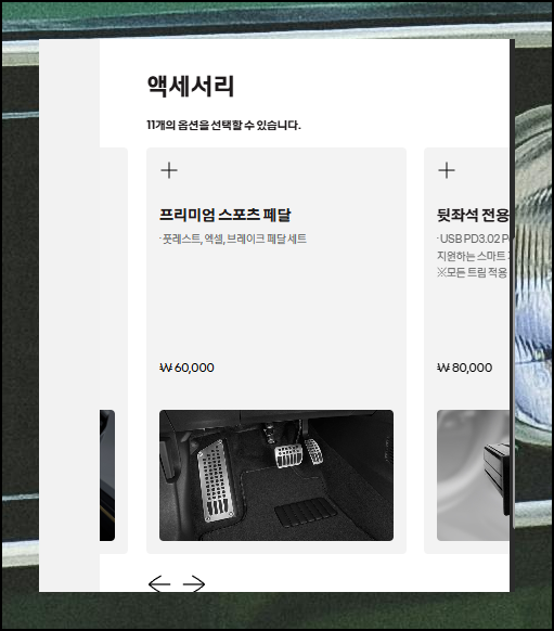 마지막으로 각종 액세서리를 선택하는 단계예요. 프리미엄 스포츠 페달, LED 랜프세트 등 꼭 필요한 것은 아니지만, 자신의 취향에 맞는다면 선택하는 것도 좋습니다. 이렇게 모든 선택이 완료되면 '내 차에 적용하기' 버튼을 눌러서 다음 단계로 진행하면 됩니다.