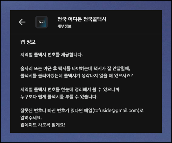 벌써 50만 명이 넘는 사용자들이 선택한 신뢰할 수 있는 앱이에요. 서울을 비롯해 전국 각지의 택시 회사 연락처가 모두 수록되어 있어요. 데이터가 꾸준히 업데이트가 되고 있어서 믿고 사용할 수 있습니다.