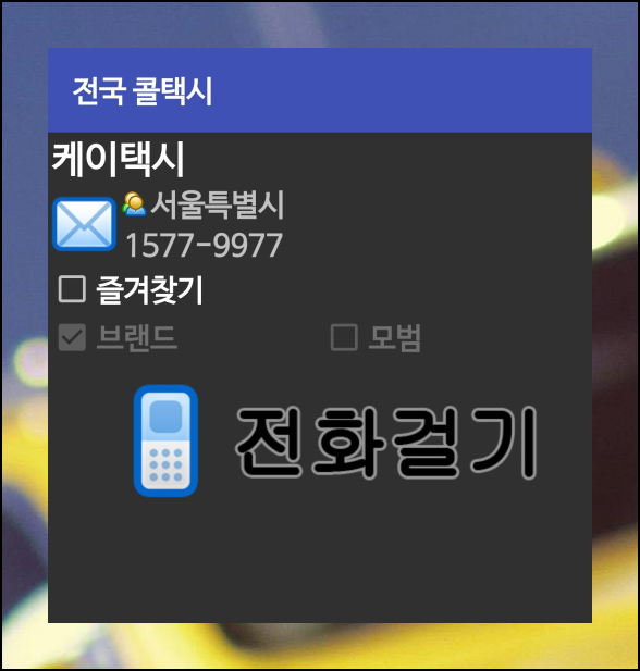택시 업체 중 한 곳을 선택해보겠어요. 희망하는 업체를 터치하면 곧바로 예약 전화번호로 연결이 가능해요. 자주 이용하는 업체는 즐겨찾기 기능을 통해 등록해두면 훨씬 간편합니다.