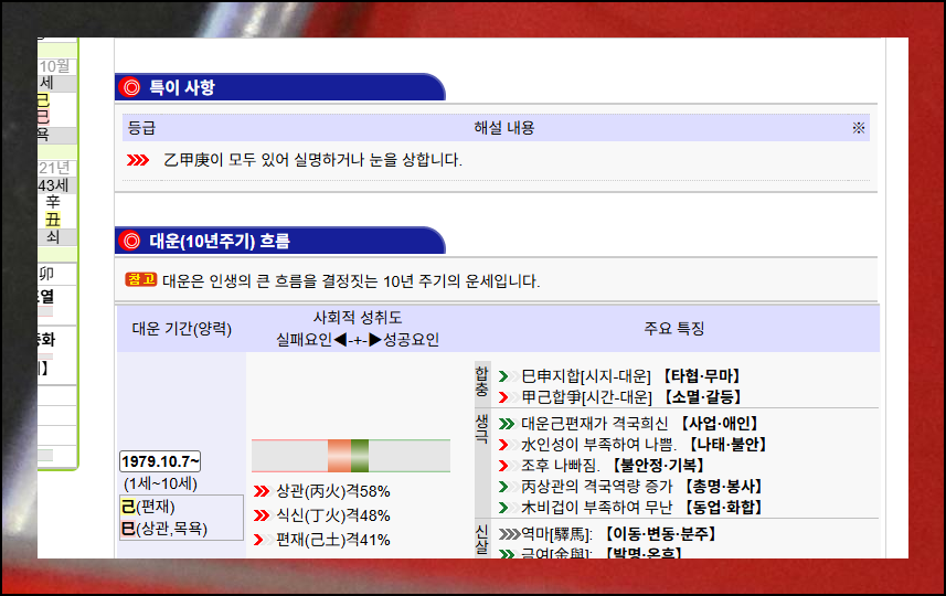 연도별 사회적 성취도를 미리 확인할 수 있고, 세부 특징에서 인간관계와 성과, 노력과 재물 등을 체크할 수 있어요.