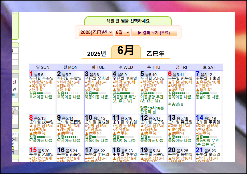 택일 만세력 서비스에 대해 알아보겠습니다. 원하는 연도와 월을 설정한 후 [결과 보기] 버튼을 눌러주세요. 달력 모양으로 운세 정보가 나타날 거예요.