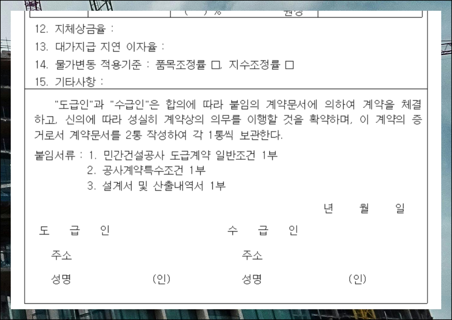 민간건설공사 특성상 예기치 못한 변경 사항이 발생할 수 있으니 추가 약정을 위한 여백도 마련되어 있습니다. 체결을 완료할 때는 일반 조건과 특별 조건 서류들을 함께 첨부하고, 계약서에 발주자와 수급인이 모두 서명해야 합니다.