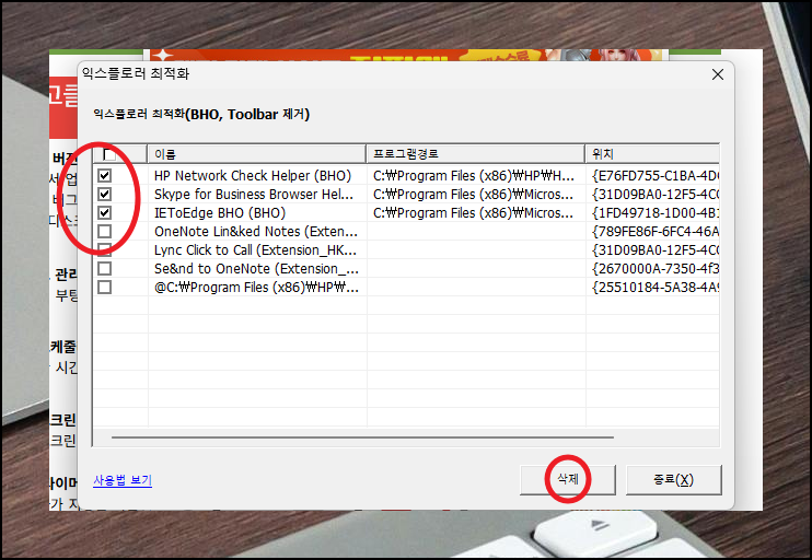 이런 불필요한 도구들을 모두 택한 후 시스템에서 완전히 제거해주시면 됩니다. 제거 과정은 매우 간단한데, 각 이름 앞에 있는 체크박스를 선택한 후 화면 우측 하단에 위치한 삭제 버튼을 클릭하기만 하면 완료됩니다.