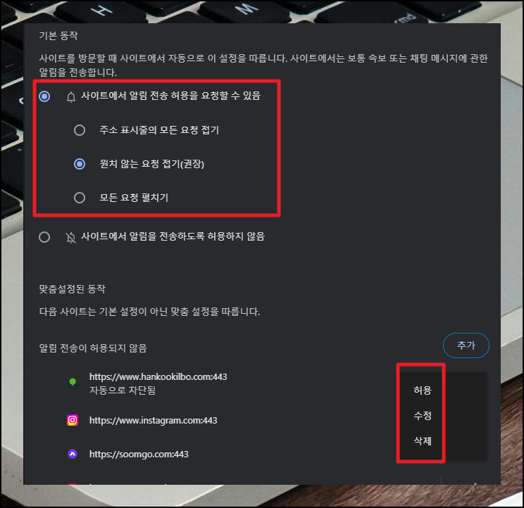알림 설정 페이지를 예시로 자세히 설명드려보겠습니다. 알림 전송이 허용됨이라는 텍스트 아래쪽을 보시면 다양한 웹사이트 주소들이 목록으로 표시되어 있을 거예요. 각 사이트명 오른쪽 끝에 있는 점 세 개 아이콘을 클릭하면 차단, 수정, 삭제라는 세 가지 옵션이 나타납니다. 성가신 광고창이 안뜨게 만들려면 이 중에서 차단이나 삭제 중 하나를 선택하시면 효과적으로 해결할 수 있습니다.