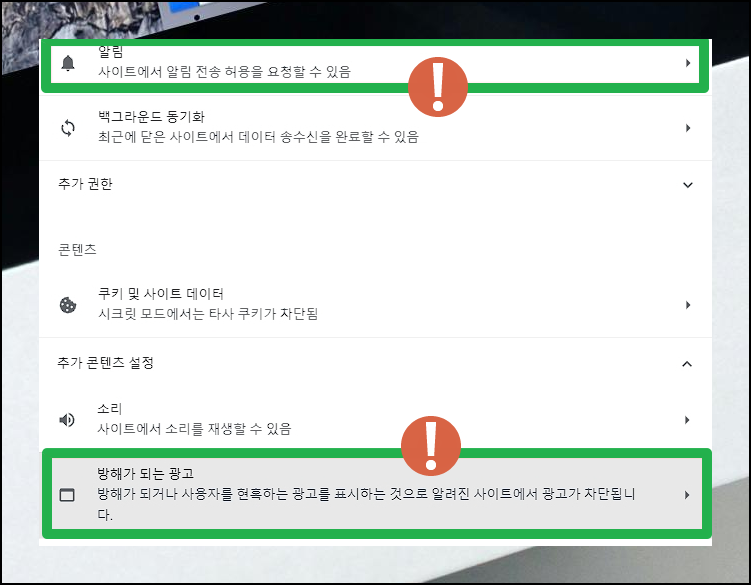 사이트 설정 페이지에서 찾아야 할 두 가지 중요한 메뉴가 있어요. 화면 위쪽에 있는 알림 설정과 추가 콘텐츠 설정 영역의 방해가 되는 광고 옵션입니다. 이 두 메뉴를 각각 클릭해서 들어가면 현재 허용되어 있는 사이트 목록을 확인할 수 있습니다. 여기서 불필요한 인터넷 광고창을 생성하는 사이트들을 찾아서 차단하거나 완전히 제거해주시면 됩니다.