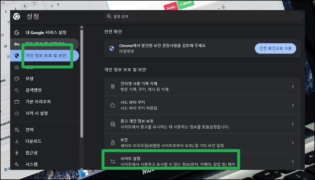 현재 인터넷을 이용할 때 가장 널리 사용되는 크롬 브라우저를 기준으로 설명해드릴게요. 브라우저 화면 오른쪽 상단 모서리에 있는 점 세 개로 된 메뉴 버튼을 클릭하세요. 메뉴가 나타나면 하단 부분에 위치한 설정 항목을 선택합니다. 설정 화면으로 이동하면 왼쪽 메뉴에서 [개인 정보 보호 및 보안] 섹션을 찾아 클릭하고, 그 다음 사이트 설정 옵션을 선택하면 됩니다.