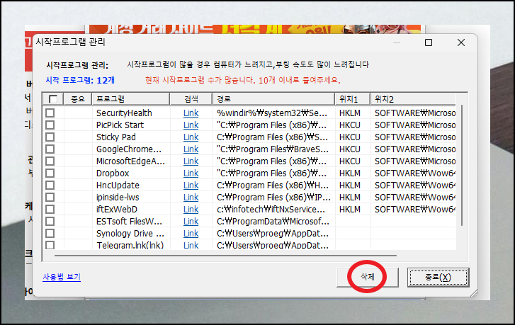 끝으로 시작 프로그램 관리 기능도 활용해보세요. 이 기능을 실행하면 컴퓨터 부팅 시점에 자동으로 실행되도록 설정된 모든 목록을 한눈에 확인할 수 있습니다. 여기서 인터넷 광고창을 실행시키는 역할을 하는 요소들을 찾아내서 삭제해주면 되는데요.