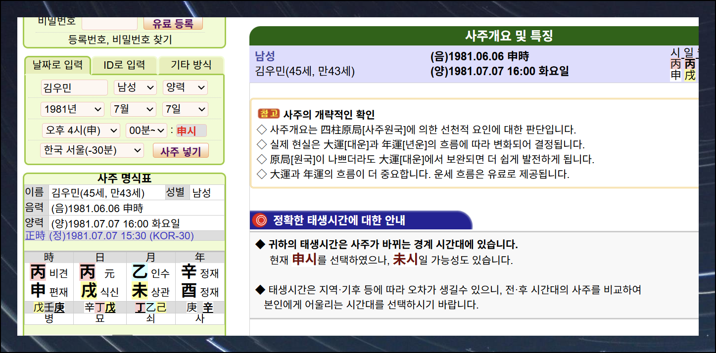 사주풀이 도우미 사이트에 접속하면 화면 좌측 상단에 사주 정보를 입력하는 부분이 있어요. 앞서 원광 만세력에서 입력했던 것과 같은 정보를 넣어주시면 됩니다. 정보를 입력하면 바로 아래에 원광에서 본 것과 동일한 사주명식도가 나타나요. 우측에는 '사주개요 및 특징'이 표시되는데, 여기서 좀 더 자세한 내용을 확인할 수 있습니다.