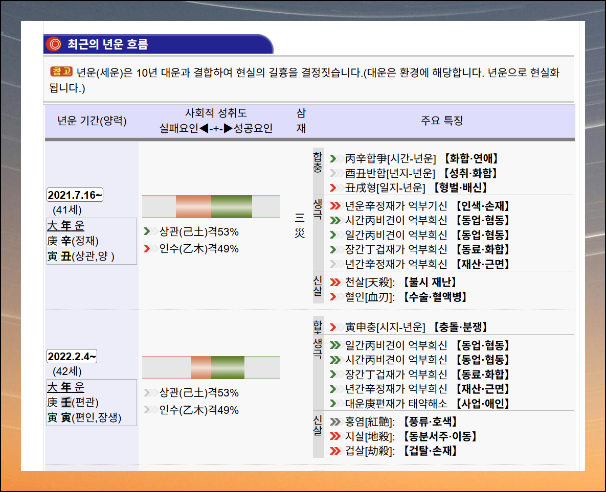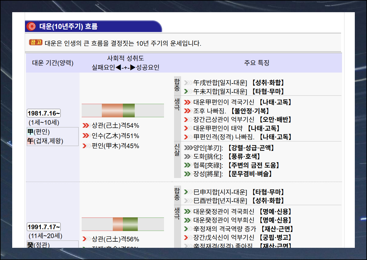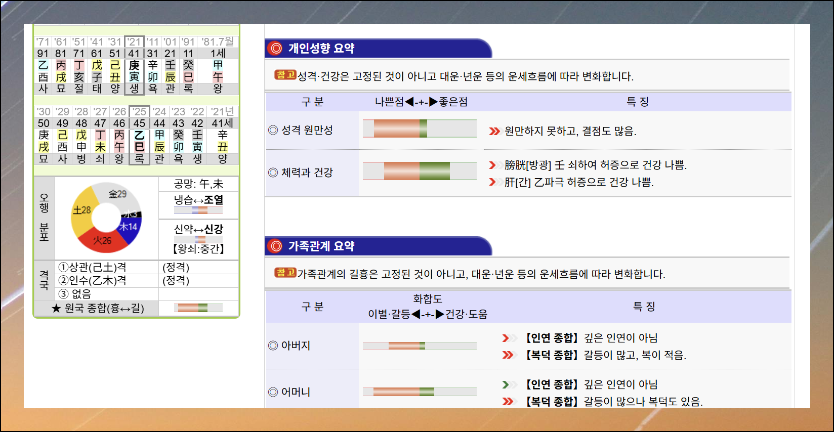 대운과 연운은 물론 개인 성향이나 가족관계, 사회생활 운세까지 한 번에 파악할 수 있어서 정말 유용해요.