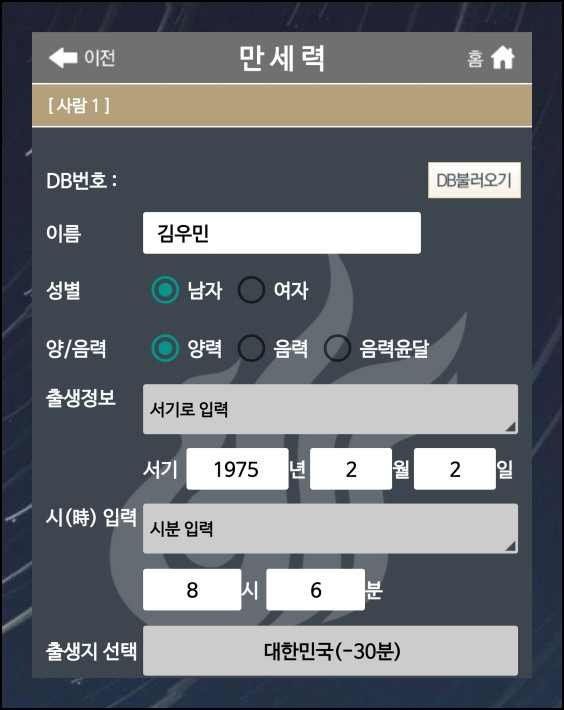 화면이 바뀌면서 사주 정보를 입력하는 창이 나타나요. 이름, 성별, 양력 또는 음력 선택, 생년월일, 출생 시, 출생지를 차례로 입력해주세요. 모든 정보를 정확히 입력했다면 '명조 보기' 버튼을 눌러주시면 됩니다. 그러면 원광 만세력 앱의 화면이 바뀌면서 사주명식도와 대운, 연운에 관한 표가 나타나요.