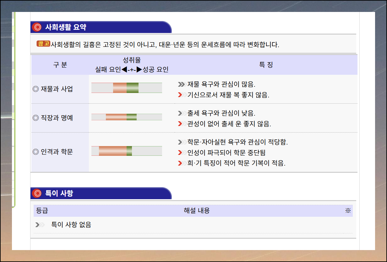 사회생활과 관련된 내용도 자세히 나와 있는데요. 재물과 사업, 인격과 학문, 직장과 명예에 관한 나의 운에 대해 보는 것도 가능합니다. 자신이 사회적으로 어떤 성향의 사람인지 파악하거나 어떤 운이 들어올지 알고 싶을 때 매우 유용해요. 이런 방식으로 만세력을 해석하면 됩니다.