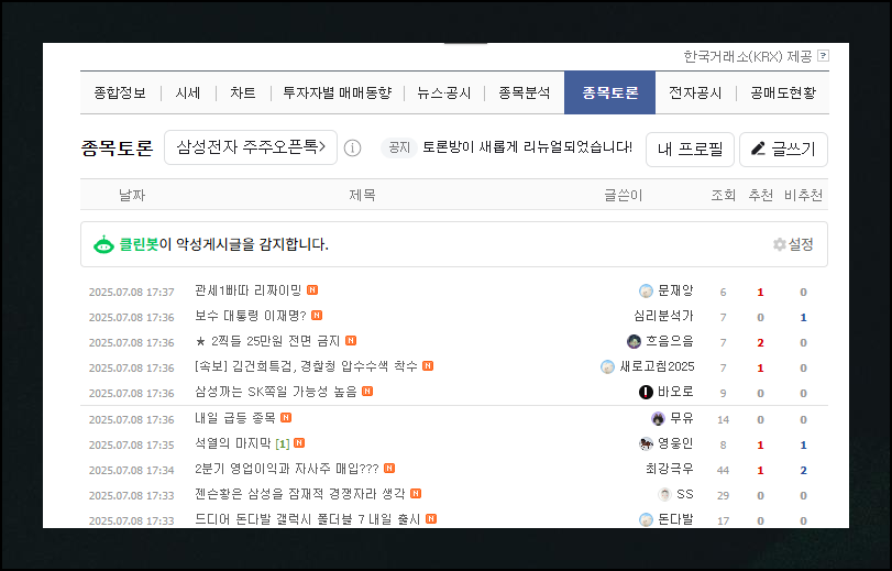 주식 투자를 하다 보면 가끔 심심할 때가 있잖아요. 그럴 때는 종목토론실을 이용해보세요. 여러 사람들과 의견을 나눌 수 있는 공간이에요. 이런 식으로 실시간 주식 현재가 보는 법을 활용하여 다양한 정보에 접근해보시길 바랍니다.