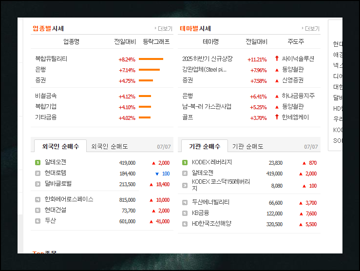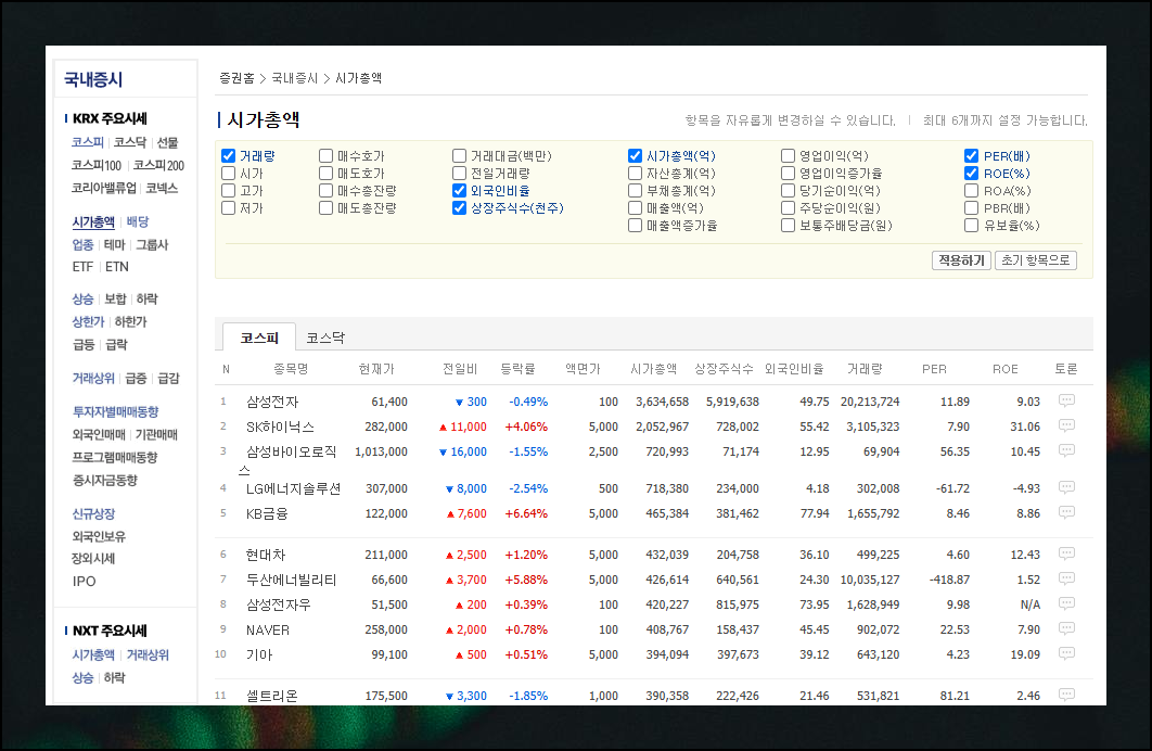 메뉴에서 국내증시를 클릭하면 본격적인 실시간 주식 현재가 조회가 시작돼요. 국내증시 페이지 왼쪽을 보면 주요시세정보 메뉴가 있습니다. 마음에 드는 종목을 쉽게 찾을 수 있도록 도와주는 기능이에요.