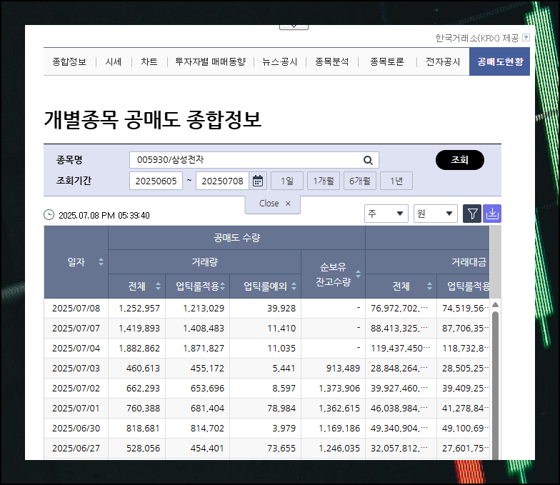 요즘 공매도 관련 뉴스가 자주 나오고 있죠. 네이버 증권 사이트에서는 개별종목 공매도 종합정보를 확인할 수 있어요. 삼성전자의 경우 최근에 공매도 수량이 조금 늘어난 것을 확인할 수 있습니다.