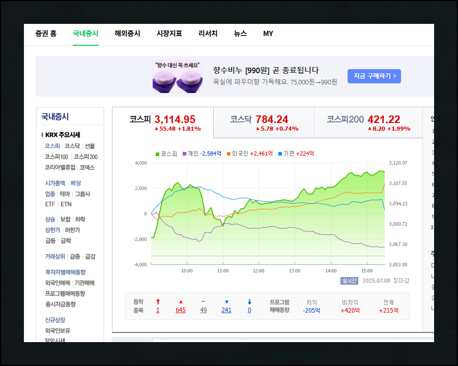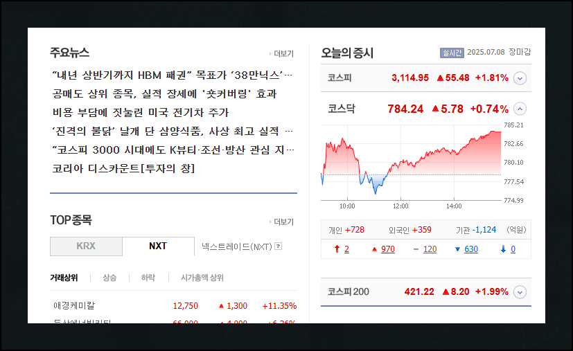 네이버 증권 사이트에 접속하면 제일 먼저 해야 할 일이 있어요. 주요 뉴스와 오늘의 증시 현황을 보는 것입니다. 개별 종목들은 큰 틀에서 주요 뉴스와 지수의 영향을 받을 수밖에 없거든요. 이런 거시적인 흐름을 먼저 살펴보는 게 중요해요.