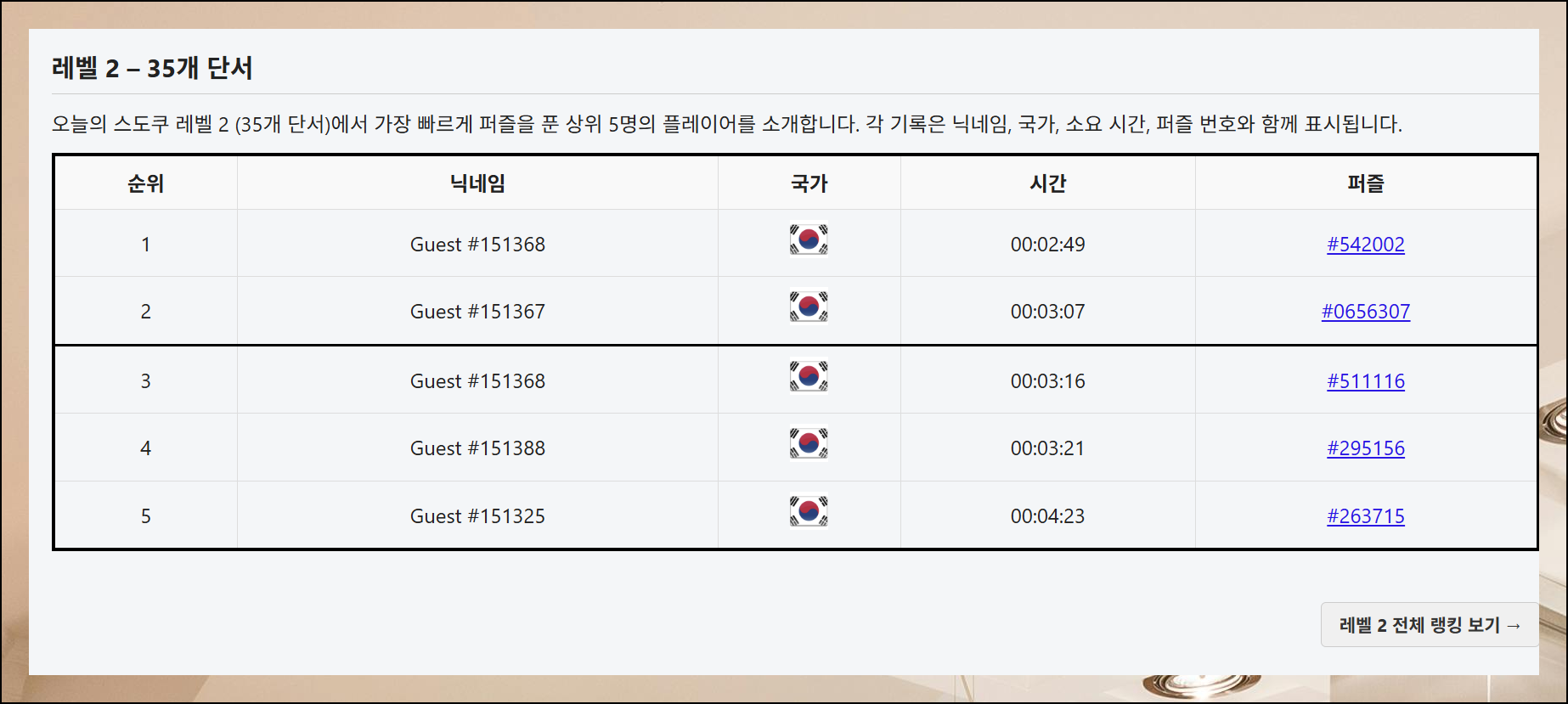 파일 다운로드 방식보다 온라인에서 바로 해결하는 것이 훨씬 실용적입니다. 답을 화면에 입력하면 규칙 위반 여부를 즉시 확인할 수 있어요. 자신의 수준에 맞는 스도쿠를 선택해서 도전할 수 있죠. 더 나아가 퍼즐을 푸는 시간이 자동으로 기록되어 실력 향상 정도를 파악하기에도 안성맞춤입니다.