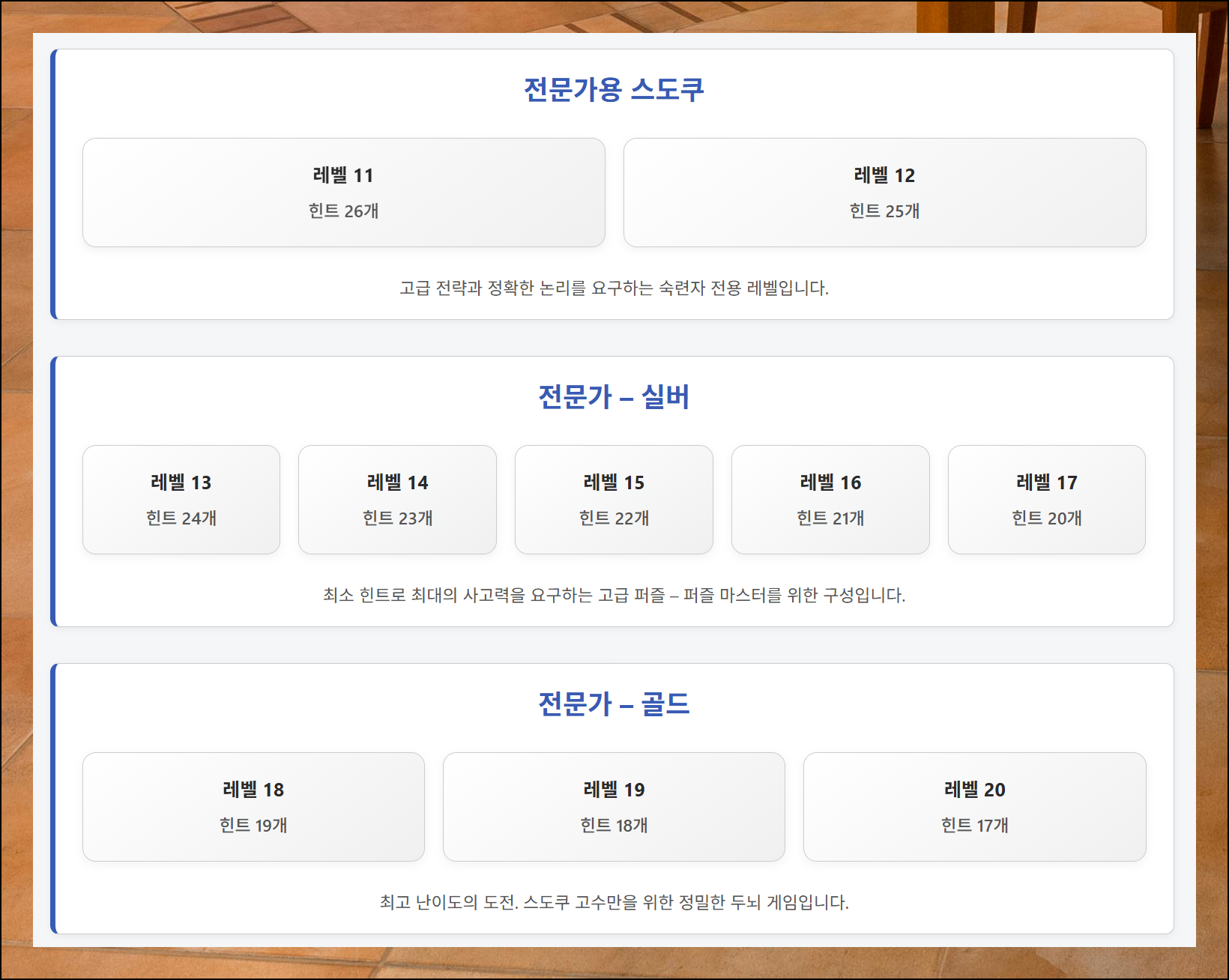 사이트를 아래로 스크롤하면 다양한 문제모음 리스트가 나타나요. 9x9 크기는 1단계부터 20단계까지 제공한다고 하네요. 초급부터 전문가까지 총 6단계로 분류되어 있습니다. 처음 도전하는 분들은 1단계부터 차근차근 풀어보시면 돼요.