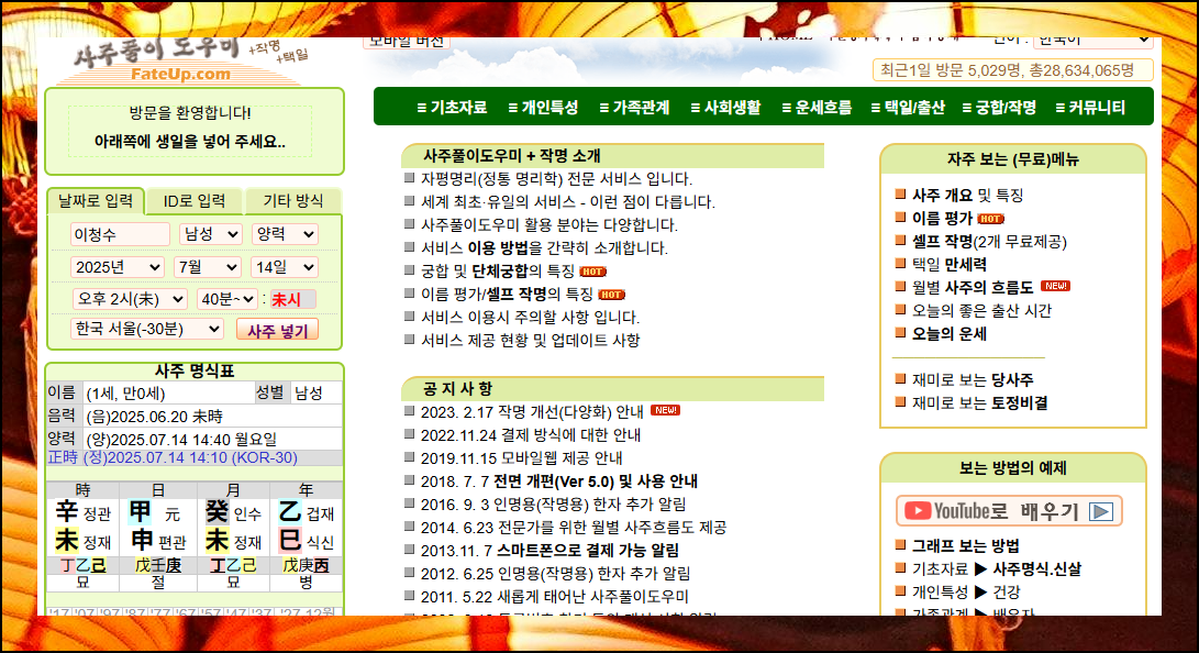 국내에서 인기 있는 역술 사이트인 사주풀이 도우미를 통해 나의 운을 알아보는 과정을 상세히 설명해드리겠습니다. 이 사이트는 사주보는방법은 물론이고, 궁합이나 작명 같은 다양한 역술 서비스를 제공하는 곳이에요.