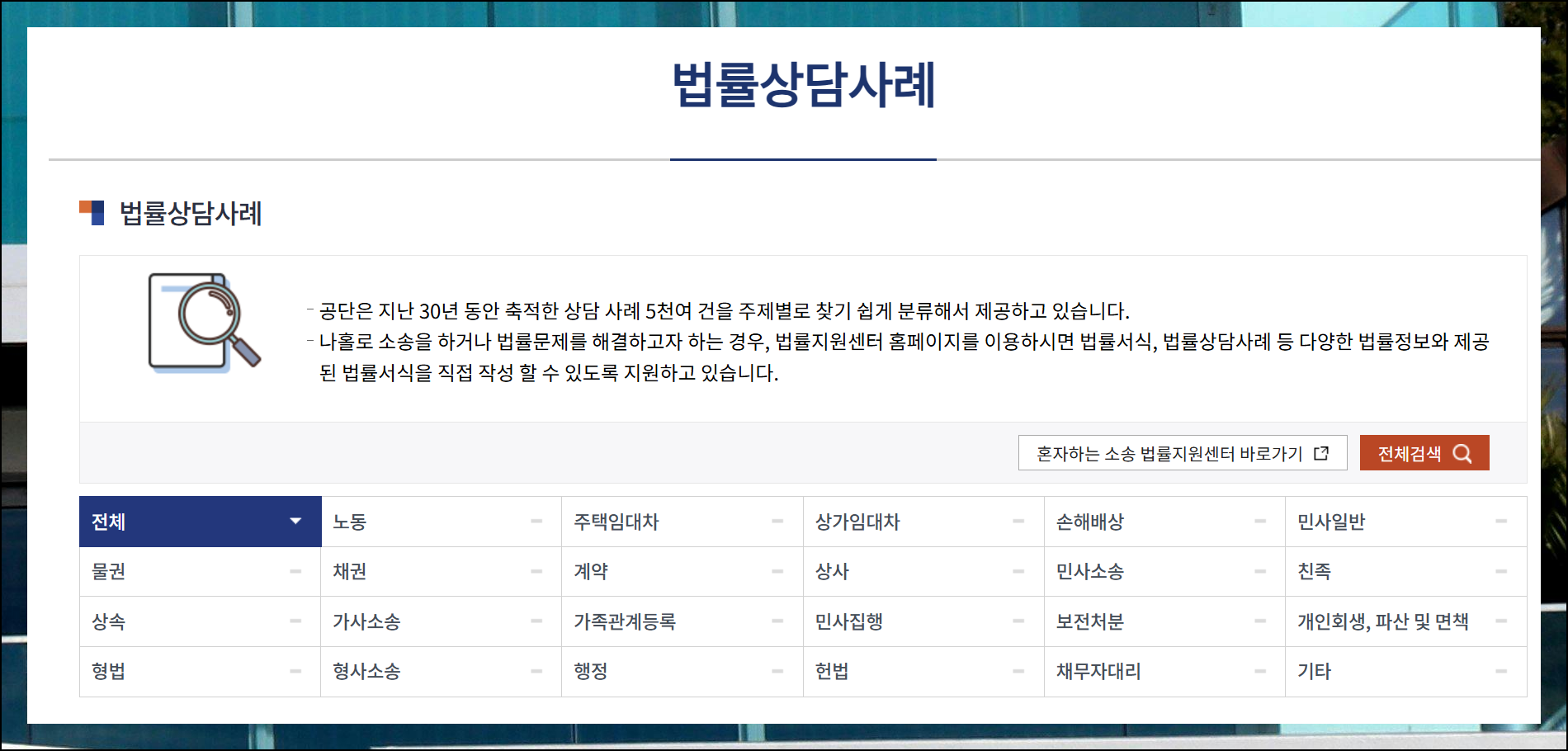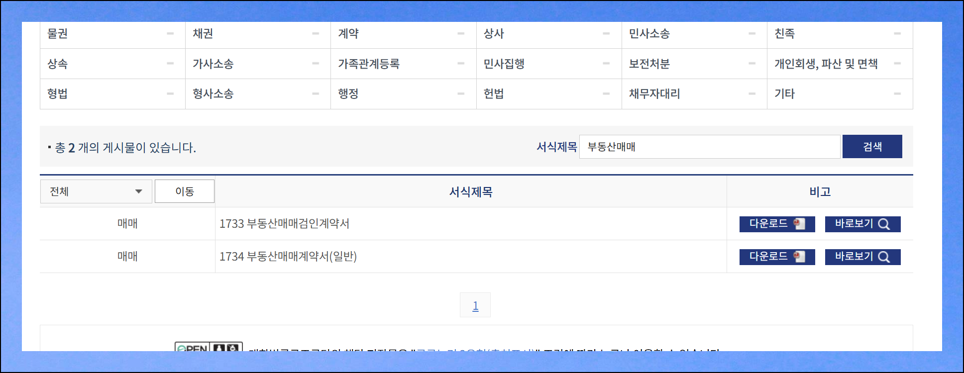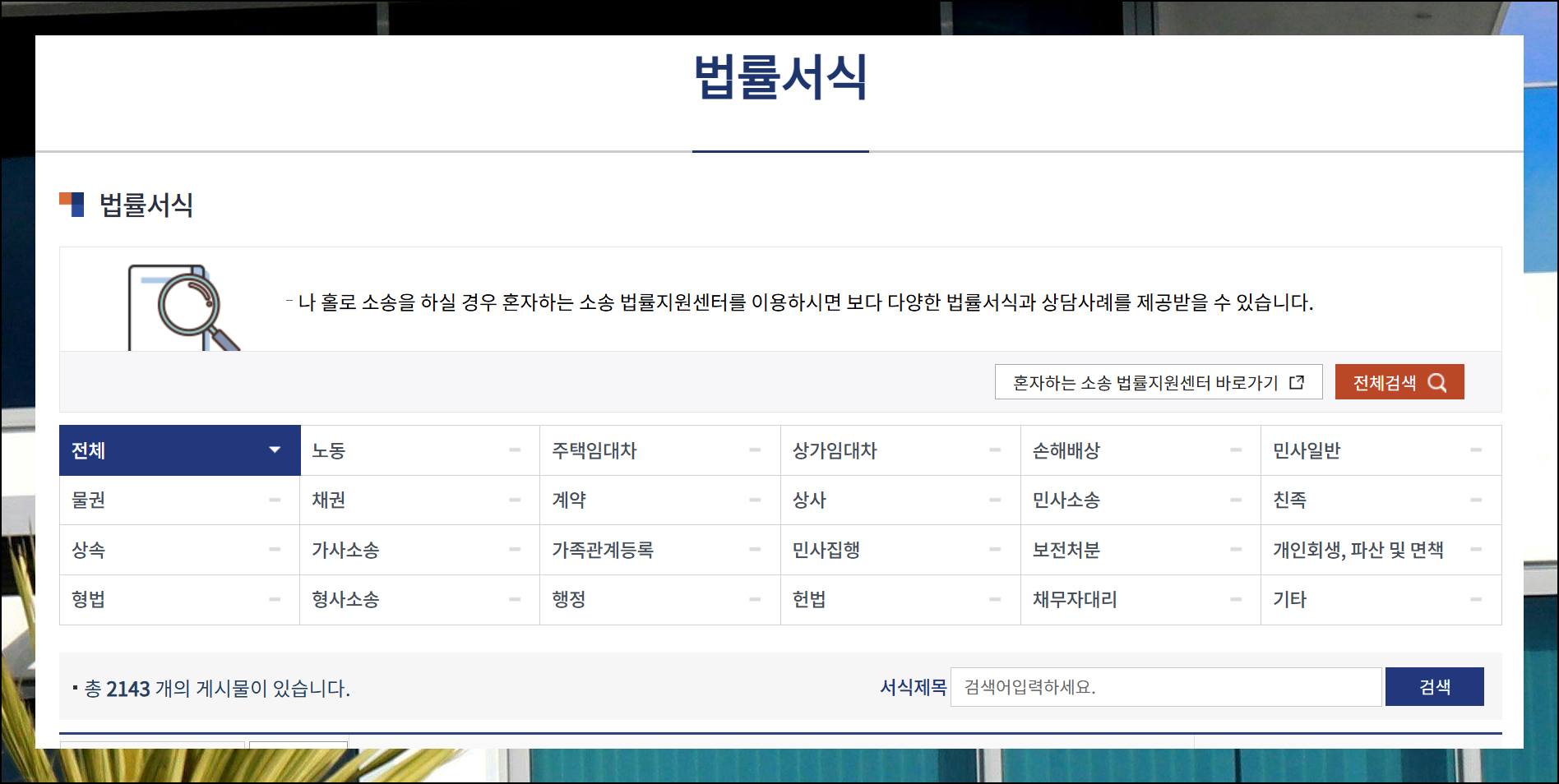 법률구조공단에서는 무려 2000개가 넘는 다양한 서식을 남녀노소 누구나 양식무료다운 받을 수 있도록 체계적으로 관리하고 있어요. 부동산 매매는 물론 주택 임대차 및 상가 계약서, 각종 손해배상 서류까지 일반인이 일상생활에서 마주할 수 있는 거의 모든 법률 문서가 준비되어 있습니다.