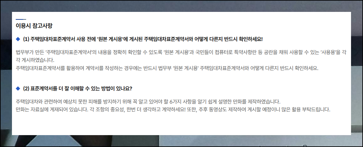 주택 임대차 진행시에는 홈페이지 상단의 주택임대차표준계약서 메뉴를 이용해보세요. 아파트, 다세대주택, 단독주택 등 각종 주거 형태에 맞춤화된 전월세 양식을 무료로 이용하실 수 있어요. 거주 형태별 특징을 고려한 차별화된 서식이 마련되어 있습니다.