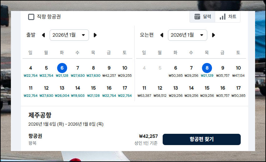 달력을 펼쳐놓고 한 달 전체를 살펴보면서 여행 가능한 날짜를 체크하는 게 핵심이에요. 땡처리 특가를 잡으려면 여행을 하고자 하는 날짜를 조절할 수 있으면 좋습니다. 일단 목적지를 제주로 설정하고, 직항 조건을 선택한 다음 검색을 진행해주세요.