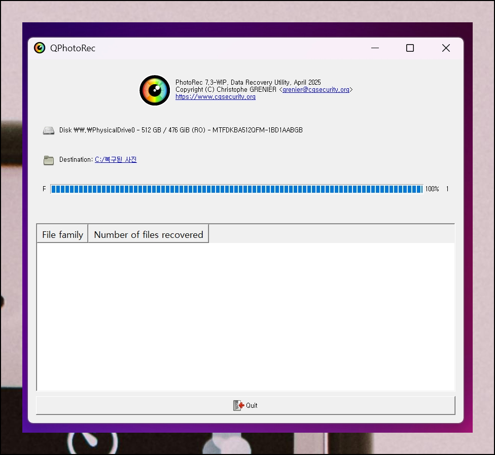 복구방법 실행 시간은 컴퓨터 성능과 모바일 기기 용량에 따라 차이가 나요. 보통 1기가당 1분 정도 소요된다고 보시면 돼요. 화면의 진행률이 100%가 되면 작업 완료예요. 지정한 폴더에 가보시면 recup_dir.1이라는 새 폴더가 생성되어 있고, 그 안에 복구된 스마트폰 사진가 들어있을 거예요.