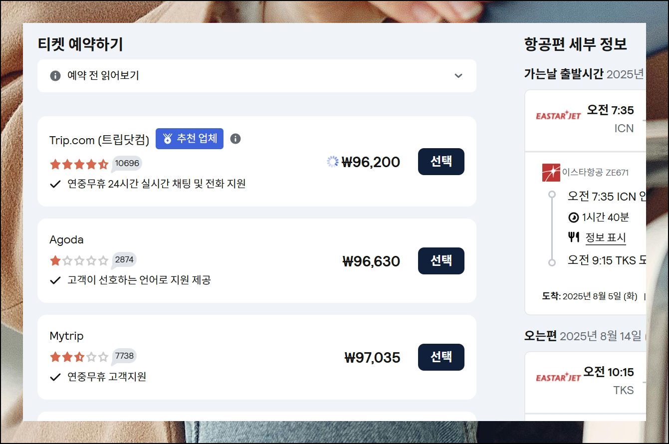 선택한 항공권의 상세 정보와 검색 결과의 금액이 일치하는지 꼼꼼히 확인하세요. 모든 조건이 맞다면 예약 버튼을 눌러서 절차를 완료하면 됩니다. 가격비교사이트에서 본 요금과 실제 예약 가격이 동일한지도 반드시 점검해보세요.