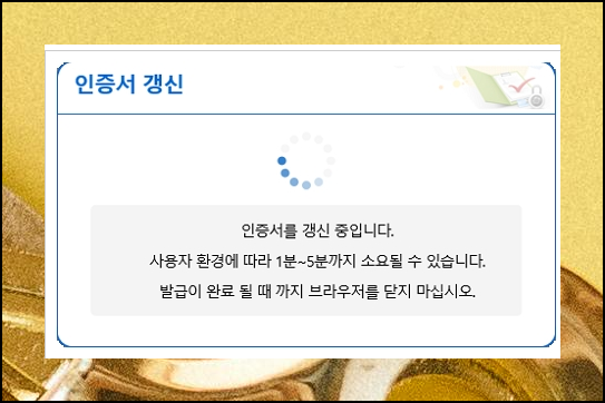 모든 정보 입력과 수수료 결제가 완료되면 갱신 작업이 자동으로 시작됩니다. 일반적으로 1분에서 5분 정도 소요되니 작업이 완료될 때까지 브라우저를 종료하지 마세요. 화면의 안내 메시지를 따라 잠깐만 기다리시면 새로운 공인인증서를 성공적으로 받으실 수 있어요.