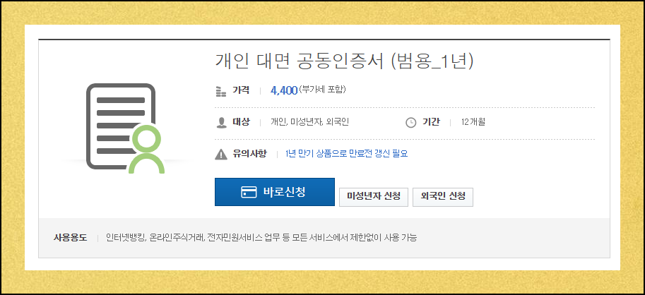 범용 공인인증서는 4400원으로 가장 폭넓은 활용이 가능해요. 은행 업무부터 증권 거래, 정부 민원까지 어디서든 자유롭게 이용할 수 있습니다. 온라인으로 간편하게 갱신 절차를 밟을 수 있어 편리해요.