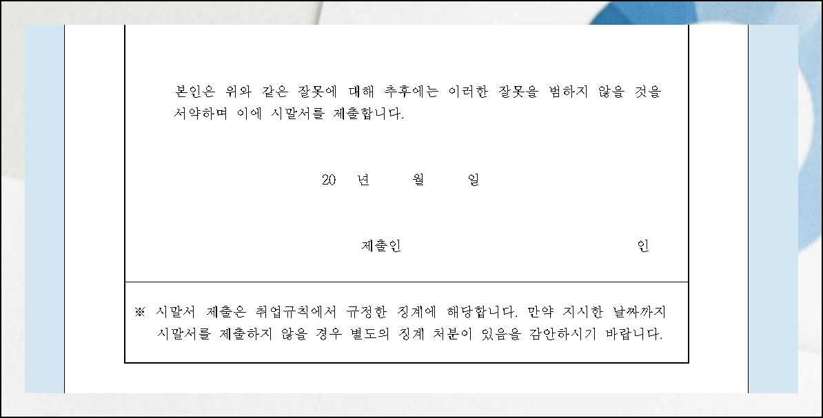 제공해드린 쓰는법 서식을 다운받아서 사용해보시면 도움이 될 거예요. "시말서"라는 문서의 진짜 목적을 제대로 아는 것이 중요합니다. 단순히 죄송하다는 말을 반복하는 사과문과는 성격이 달라요. 제대로 시말서 쓰는법을 아는 것이 좋은데요. 일어난 사실들을 정확하게 기록하고, 정리하는 것이 핵심 목표입니다. 글의 마지막 부분에서 간단한 사과 표현을 넣는 것은 적절하지만, 지나치게 반복적인 사과는 원래 취지에서 벗어나게 됩니다.