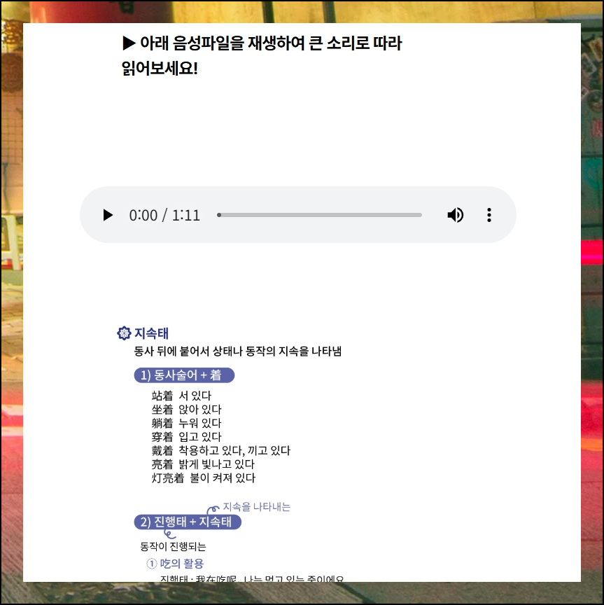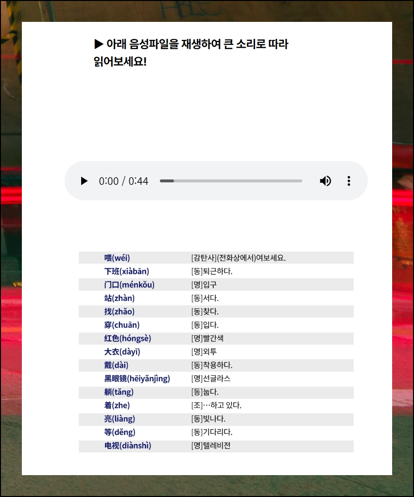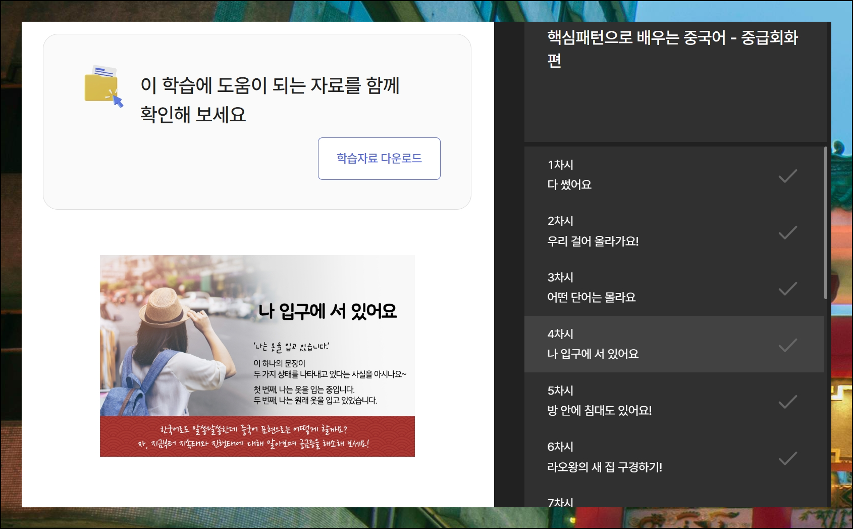 교육 콘텐츠는 2가지 방식으로 수업을 들을 수 있는데요. 로그인을 해도 되고, 그냥 로그인 없이 학습을 할수도 있어요. 그냥 학습하는 것이 편하지만, 자신의 학습 이력을 남기고 싶거나 수료증 발급을 받고 싶다면 로그인을 해주는 것이 좋습니다. 대부분의 중국어 기초 배우기 강의는 동영상으로 진행이 되는데요. 옆에 보면 함께 사용할 수 있는 학습자료도 배치가 되어 있어요. 퀴즈, 단어장, 오디오 음성 파일 등 다양하게 마련되어 있습니다 .