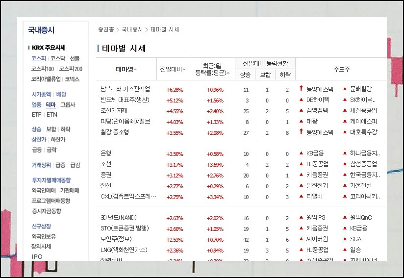 이 사이트에서는 특정 테마로 분류된 주식들의 당일 시세를 확인하는 것이 가능합니다. 해당 테마를 이끌어가는 대표 종목이 무엇인지도 쉽게 알아볼 수 있어요.